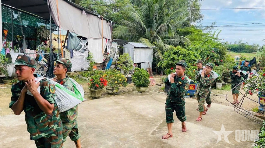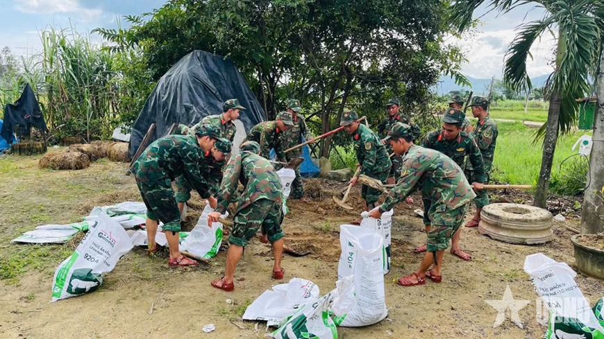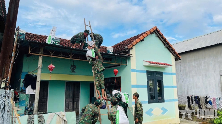 Lữ đoàn 572 (Quân khu 5) đã huy động hơn 200 cán bộ, chiến sĩ dùng bao cát giúp người dân chằng chống nhà cửa.