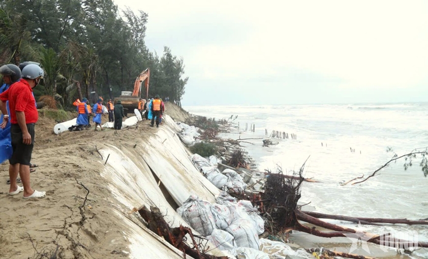 Trong điều kiện mưa kéo dài, lực lượng quân sự, biên phòng, dân quân Bộ CHQS thành phố Đà Nẵng được huy động, sử dụng vật tư, phương tiện cơ giới, bao cát để đắp kè, ngăn sóng tấn công, bảo vệ khu dân cư ven biển.