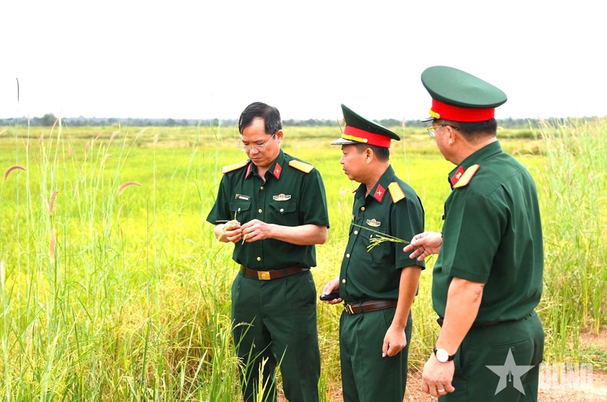 | Đại tá Lương Đình Chung, Bí thư Đảng ủy, Chính ủy Quân khu 5 kiểm tra thực tế tại mô hình trồng lúa. |