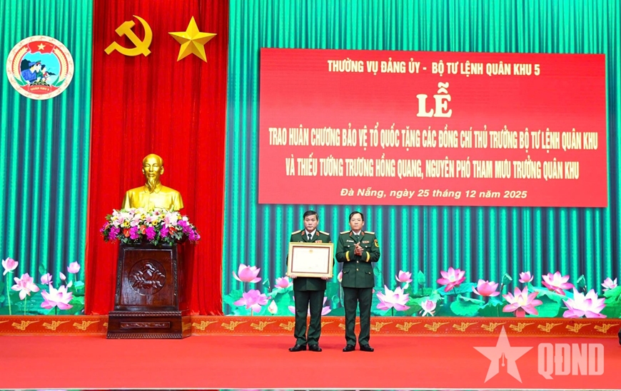| Thừa ủy quyền của Chủ tịch nước, Trung tướng Lê Ngọc Hải, Tư lệnh Quân khu 5 trao Huân chương Bảo vệ Tổ quốc tặng các đồng chí Thủ trưởng Bộ tư lệnh Quân khu và Thiếu tướng Trương Hồng Quang, nguyên Phó tham mưu trưởng Quân khu 5. |