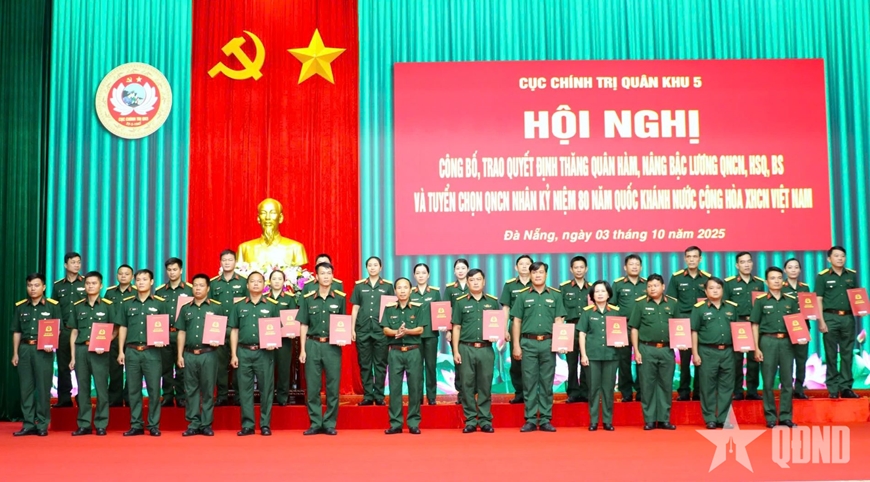 Ngày 3-10, tại TP Đà Nẵng, Cục Chính trị Quân khu 5 tổ chức công bố và trao quyết định thăng quân hàm, nâng bậc lương đối với quân nhân chuyên nghiệp, hạ sĩ quan, binh sĩ, công nhân và viên chức quốc phòng nhân kỷ niệm 80 năm Quốc khánh 2-9.
