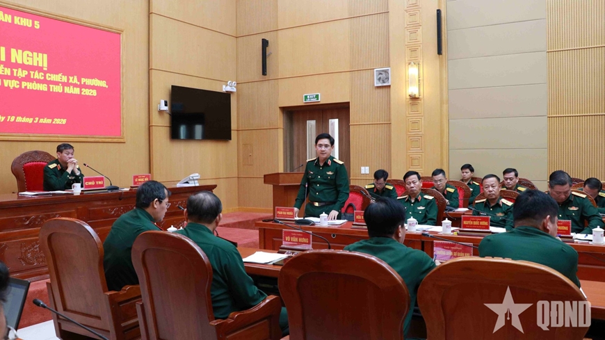 Tại hội nghị, Đại tá Võ Văn Bá, Phó tham mưu trưởng Quân khu 5 trình bày đề xuất tổ chức diễn tập năm 2026, bám sát chỉ đạo của Bộ Tổng Tham mưu theo tài liệu “Tổ chức, phương pháp diễn tập tác chiến xã, phường, đặc khu trong khu vực phòng thủ” và Mệnh lệnh công tác quân sự, quốc phòng năm 2026 của Tư lệnh Quân khu 5.
