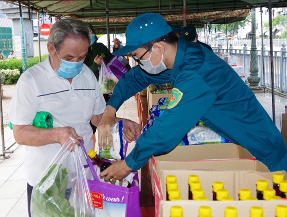 | Cán bộ, chiến sĩ quận 6, TP Hồ Chí Minh tặng quà người dân nghèo bị ảnh hưởng bởi dịch Covid-19 tại “Phiên chợ 0 đồng”. |
