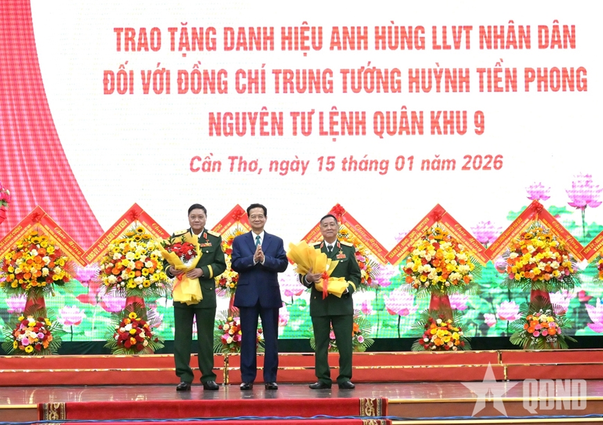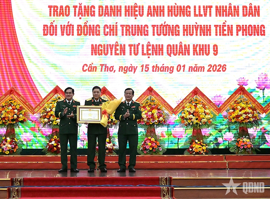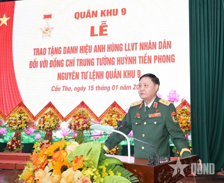 Thừa ủy quyền của lãnh đạo Đảng, Nhà nước, Quân ủy Trung ương, Bộ Quốc phòng, lãnh đạo Quân khu 9 trao tặng danh hiệu Anh hùng LLVT nhân dân đối với Trung tướng Huỳnh Tiền Phong, nguyên Tư lệnh Quân khu 9.