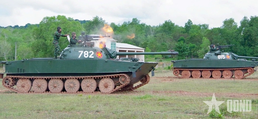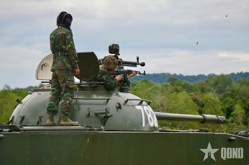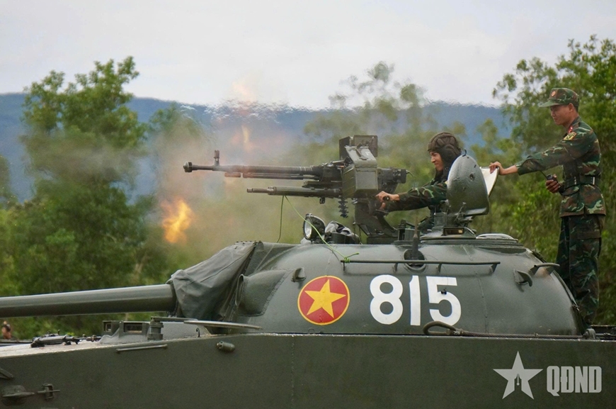| Các kíp xe thực hành bắn bài 1a, bài 2 súng máy 12,7mm trên xe tăng. |