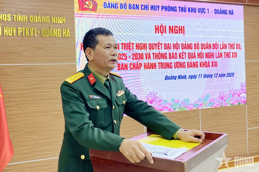 Sáng 11-12, Đảng ủy Ban Chỉ huy phòng thủ khu vực 1 - Quảng Hà (Đảng bộ Quân sự tỉnh Quảng Ninh) tổ chức Hội nghị học tập, quán triệt và triển khai thực hiện Nghị quyết Đại hội đại biểu Đảng bộ Quân đội lần thứ XII, nhiệm kỳ 2025 - 2030; đồng thời thông báo nhanh kết quả Hội nghị lần thứ 14 Ban Chấp hành Trung ương Đảng khóa XIII.