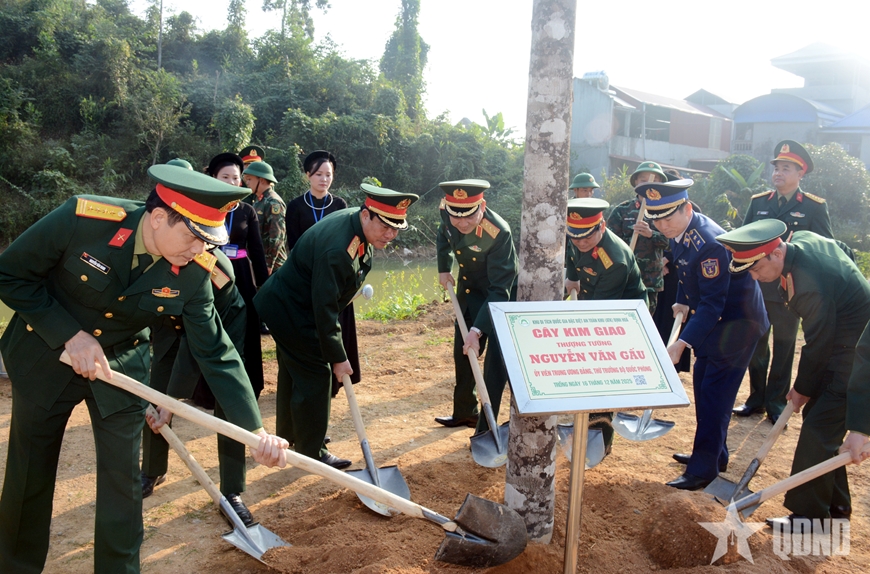 | Lãnh đạo Bộ Quốc phòng và các đại biểu trồng cây lưu niệm trong khuôn viên Đồi Pụ Đồn - Đồi phong Tướng. |