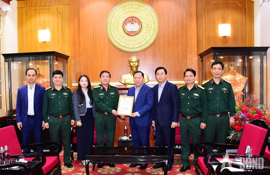 | Đồng chí Nguyễn Phi Long, Ủy viên Dự khuyết Trung ương Đảng, Phó bí thư Đảng ủy Mặt trận Tổ quốc, các đoàn thể Trung ương (thứ tư, từ phải sang) trao thư cảm ơn Quân ủy Trung ương, Bộ Quốc phòng. |