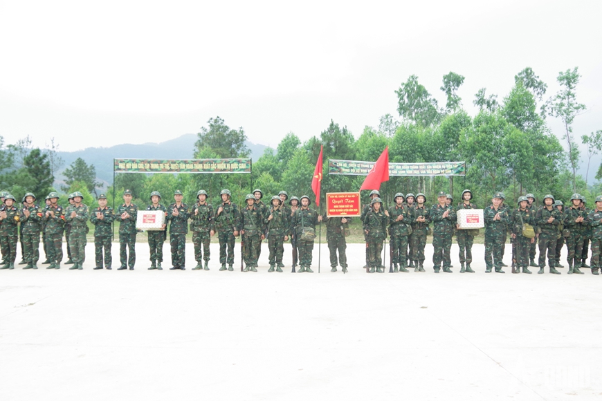 | Cán bộ, chiến sĩ tham gia diễn tập hoàn thành xuất sắc nhiệm vụ được chỉ huy các cấp tặng quà động viên. |