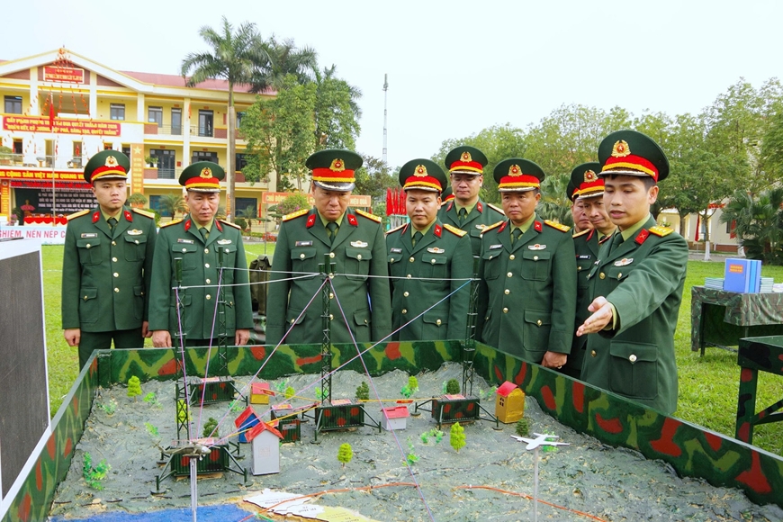 | Lãnh đạo Cục Tác chiến điện tử và các đại biểu tham quan mô hình huấn luyện của đơn vị. |
