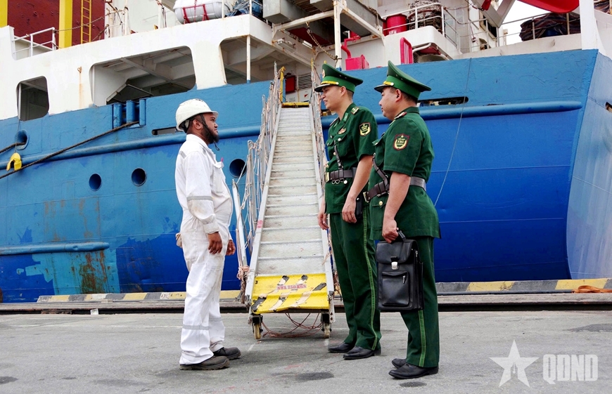 | Cán bộ, chiến sĩ Biên phòng cửa khẩu cảng Hải Phòng giao tiếp với thuyền viên người nước ngoài. |