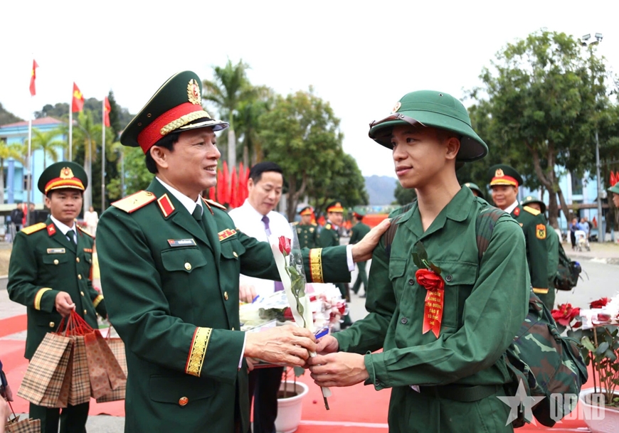 | Lãnh đạo Quân khu 2 tặng hoa chúc mừng thanh niên tỉnh Lai Châu lên đường nhập ngũ. |