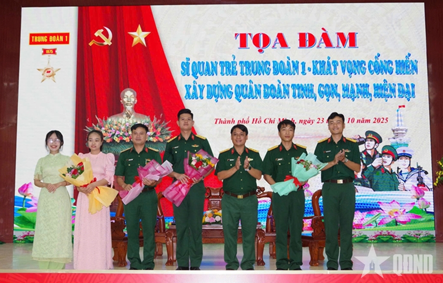 Tại buổi tọa đàm, cô Lê Thị Sương, nguyên cán bộ du kích TP Hồ Chí Minh, xúc động kể lại những năm tháng chiến đấu gian khổ, nhắn nhủ thế hệ trẻ: “Người chiến sĩ không chỉ biết chiến đấu mà còn phải sống đẹp, sống có trách nhiệm, để màu xanh áo chiến sĩ mãi mãi sáng giữa đời”. Đại diện hậu phương sĩ quan trẻ, cô giáo Đỗ Thị Bích Trâm, vợ của Trung úy Huỳnh Minh Phát, Trung đội trưởng ở Đại đội 7, Tiểu đoàn 2, Trung đoàn 1 chia sẻ: “Gia đình luôn là hậu phương vững chắc, tiếp thêm niềm tin để các anh yên tâm công tác, giữ trọn lời thề với Tổ quốc”.