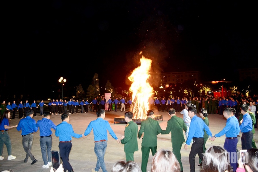 | Các đại biểu tham gia thắp lửa truyền thống cùng đoàn viên, thanh niên. |