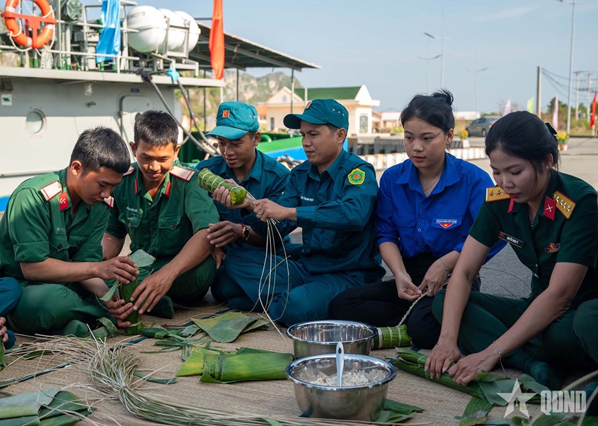 Cán bộ, hội viên, đoàn viên và chiến sĩ Hải đội Dân quân Thường trực đã cùng nhau gói 250 đòn bánh tét gửi tặng cán bộ, chiến sĩ đang thực hiện nhiệm vụ.