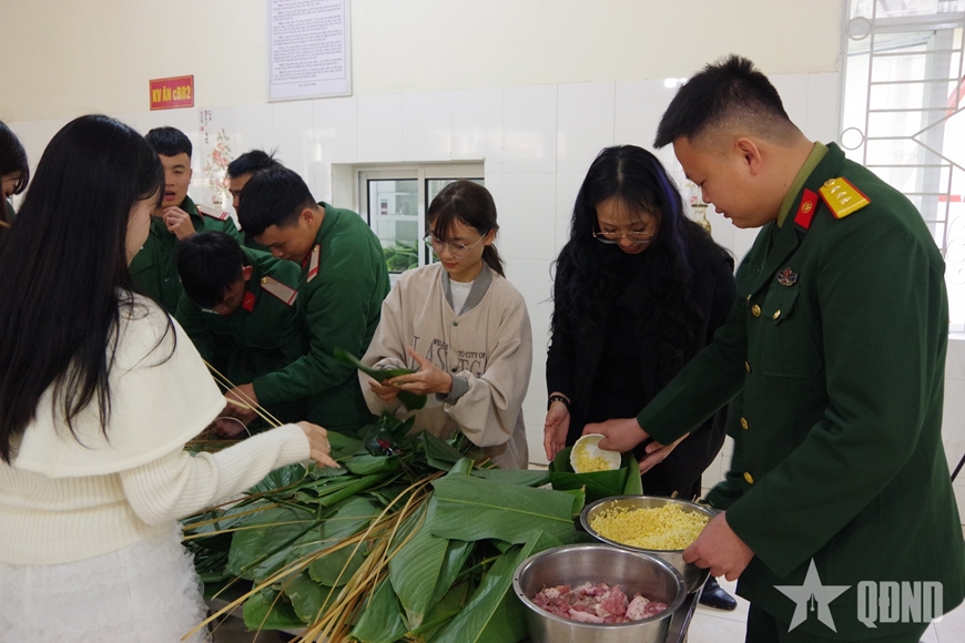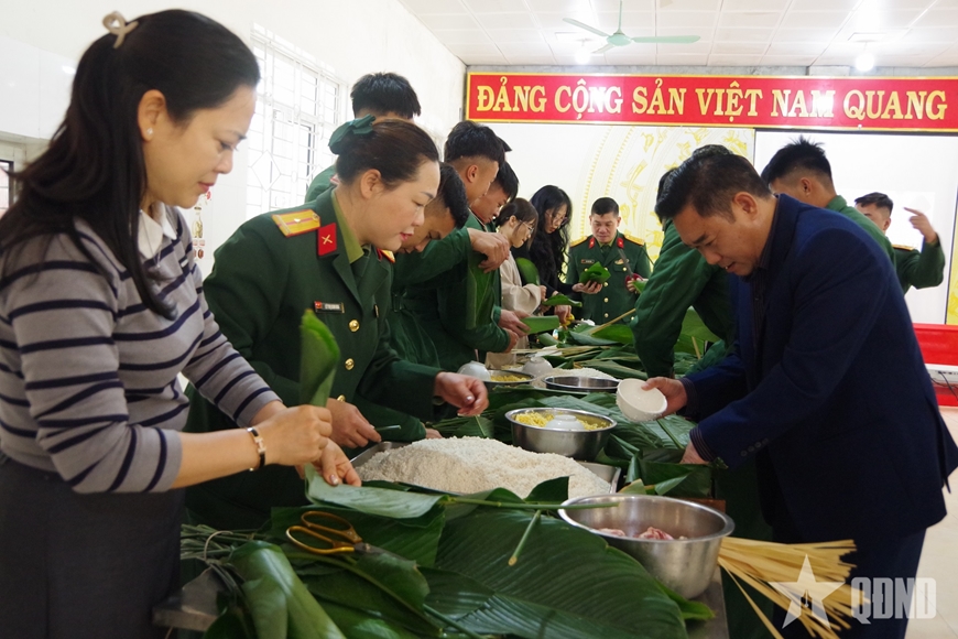 | Niềm vui của cán bộ, chiến sĩ với những sản phẩm từ chính bàn tay khéo léo gói bánh. |