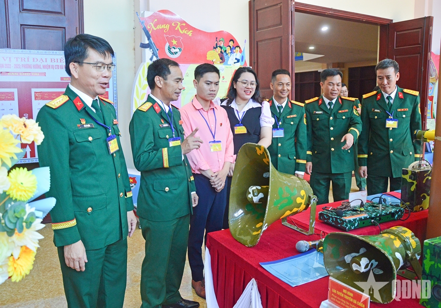 Đại tá Nguyễn Đức Hà, Phó chủ nhiệm Chính trị Quân đoàn 34 (đứng thứ 2, từ trái sang) và các đại biểu tham quan mô hình, sáng kiến của tuổi trẻ Sư đoàn 10 trưng bày tại hội nghị.