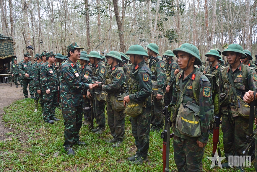 | Thiếu tướng Trần Công Đức (bắt tay chiến sĩ) và Thiếu tướng Nguyễn Trần Long động viên cán bộ, chiến sĩ tham gia diễn tập. |