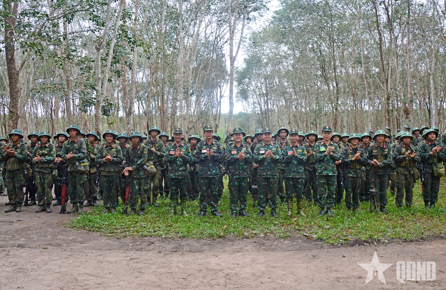 | Lãnh đạo Quân đoàn 34 và các cơ quan Quân đoàn 34, Sư đoàn 10 chụp ảnh chung với cán bộ, chiến sĩ tham gia diễn tập. |
