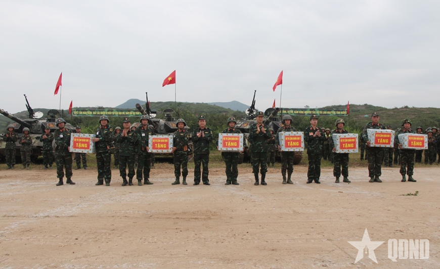 Ban chỉ đạo diễn tập Quân khu 1 tặng quà động viên các đơn vị thực binh, bắn đạn hơi trong diễn tập.