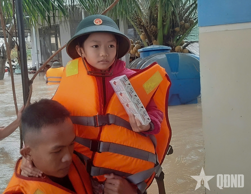 | Cán bộ, chiến sĩ Sư đoàn 31 (Quân đoàn 34) đưa người dân vượt lũ dữ. |