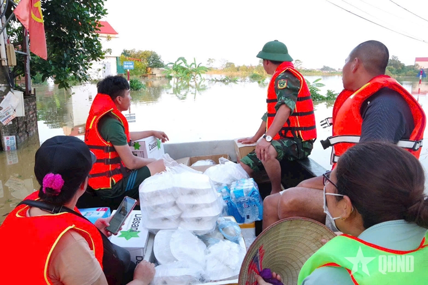 Cán bộ, chiến sĩ Sư đoàn 312 phối hợp cùng hội viên Hội Phụ nữ xã Trung Giã dùng xuồng đưa cơm và nhu yếu phẩm cho nhân dân vùng bị cô lập. |