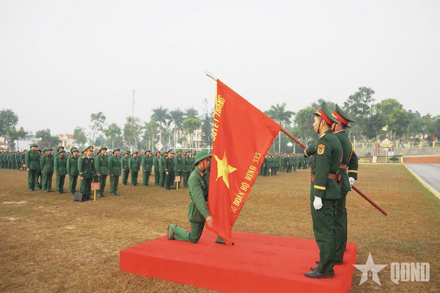 | Chiến sĩ xuất ngũ năm 2026 thực hiện nghi thức hôn quân kỳ. |