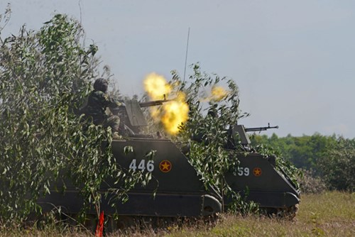 Xe thiết giáp chi viện hỏa lực tiêu diệt địch lọt vào trận địa.