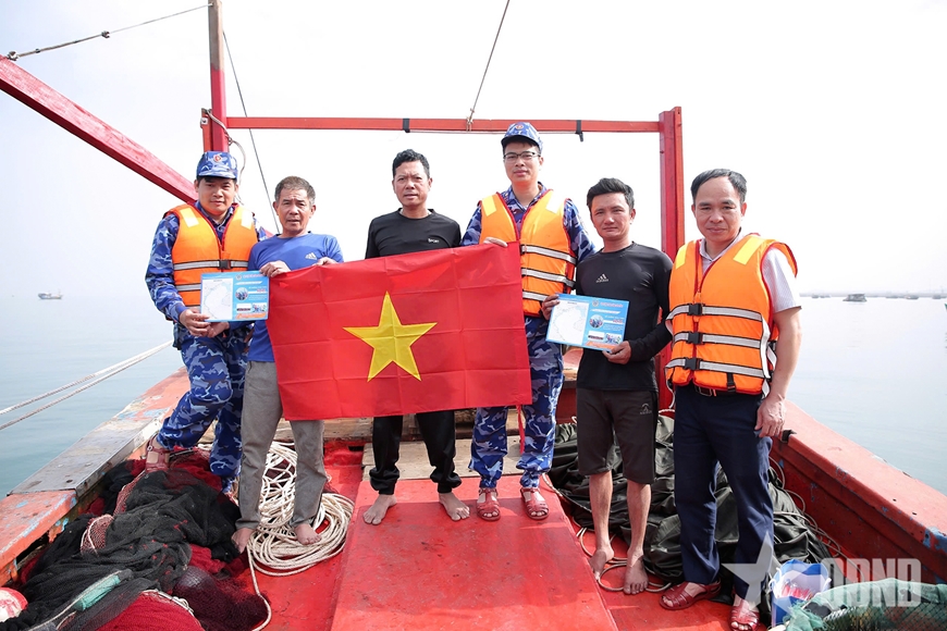 | Lực lượng Vùng Cảnh sát biển 1 phát tờ rơi và tặng cờ Tổ quốc cho ngư dân. Ảnh: LA DUY |