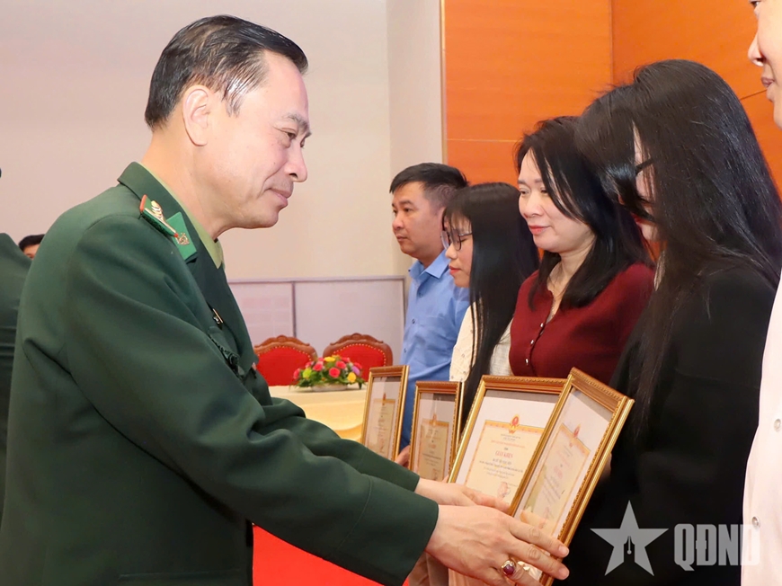| Đại tá Nguyễn Văn Hưng trao giấy khen tặng các cá nhân thuộc các cơ quan báo chí Trung ương và địa phương, Cổng Thông tin điện tử tỉnh. |