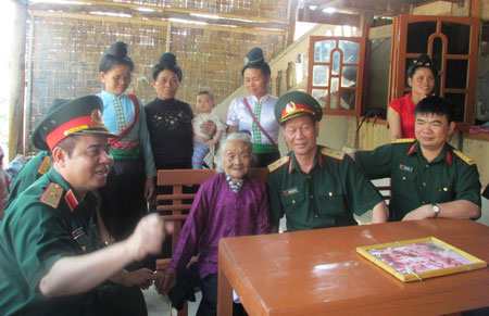 QĐND Online - Chiều 27-4, Trung tướng Nguyễn Vĩnh Phú, Chủ nhiệm Tổng cục Hậu cần (TCHC) và các thành viên đoàn công tác đã đến thăm và tặng quà cụ Lò Thị Đôi ở xã Mường Phăng (huyện Điện Biên, tỉnh Điện Biên).