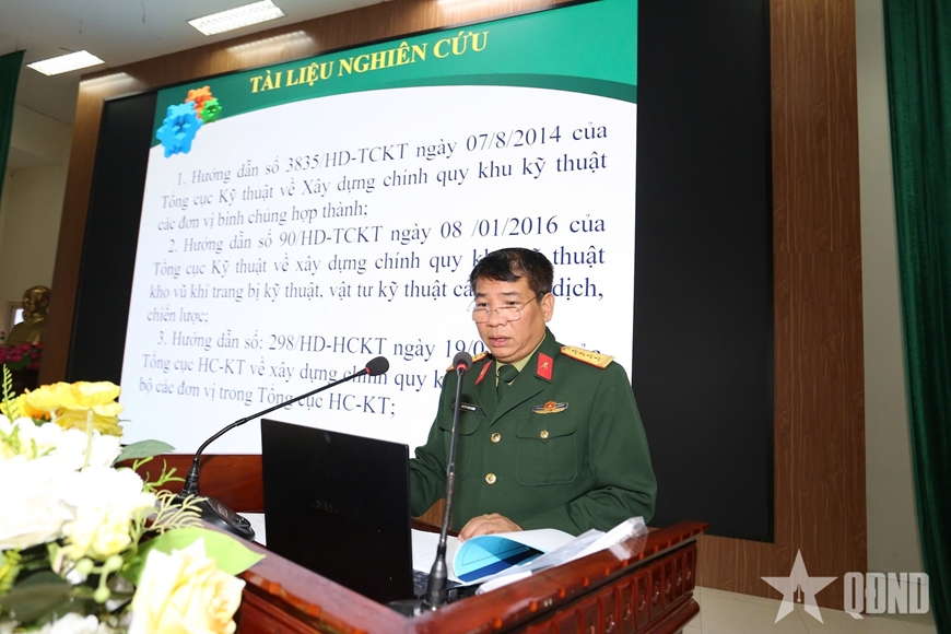 | Đại tá Nguyễn Đình Thông, Phó trưởng phòng Tham mưu - Kế hoạch, Cục Kỹ thuật quân, binh chủng lên lớp nội dung “Thống nhất xây dựng chính quy công tác kỹ thuật”. |