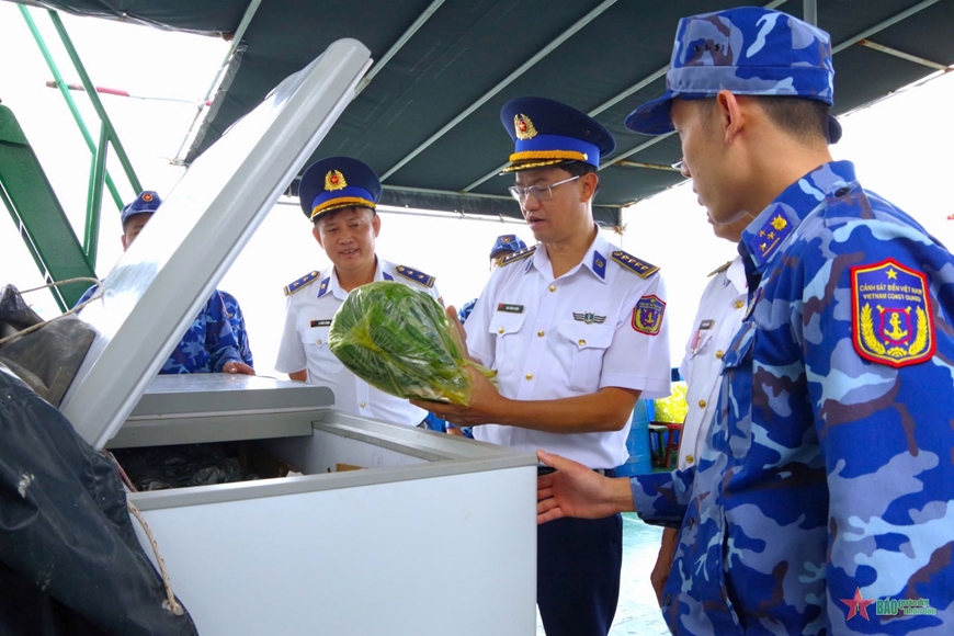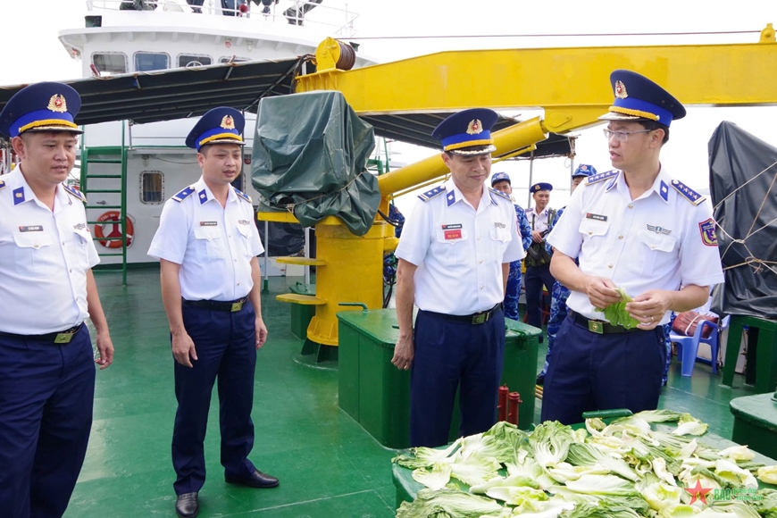Đại tá Cao Xuân Quận, Phó chính ủy Vùng Cảnh sát biển 3 kiểm tra công tác hậu cần trước khi Tàu CSB 6008 rời cảng thực hiện nhiệm vụ.