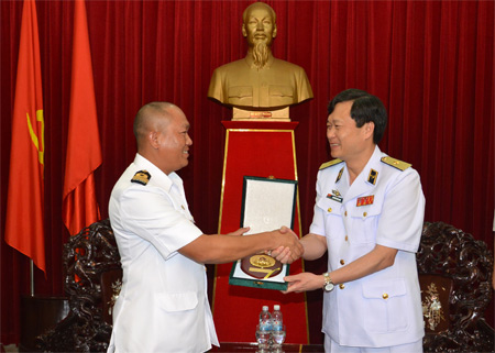 | Chuẩn đô đốc Nguyễn Văn Ninh, Phó tư lệnh Quân chủng Hải quân tặng biểu trưng Hải quân Việt Nam cho Thuyền trưởng tàu HQ Brunei |