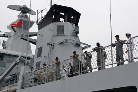 | Thủy thủ tàu làm công tác chuẩn bị khi tàu cập cảng Hải Phòng |