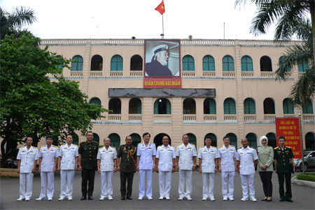| Thủ trưởng BTL Quân chủng Hải quân Việt Nam và lãnh đạo tàu Brunei chụp ảnh lưu niệm tại cơ quan BTL Quân chủng Hải quân |
