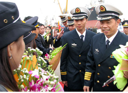 Tặng hoa cho bộ đội Hải quân Trung Quốc