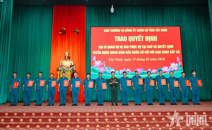 Ngày 15-2, Ban Thường vụ Đảng ủy Quân sự tỉnh Tây Ninh tổ chức hội nghị trao quyết định gọi sĩ quan dự bị vào phục vụ tại ngũ và tuyển dụng quân nhân chuyên nghiệp (QNCN) nhằm bảo đảm quân số cho Ban CHQS cấp xã, phường trên địa bàn tỉnh.