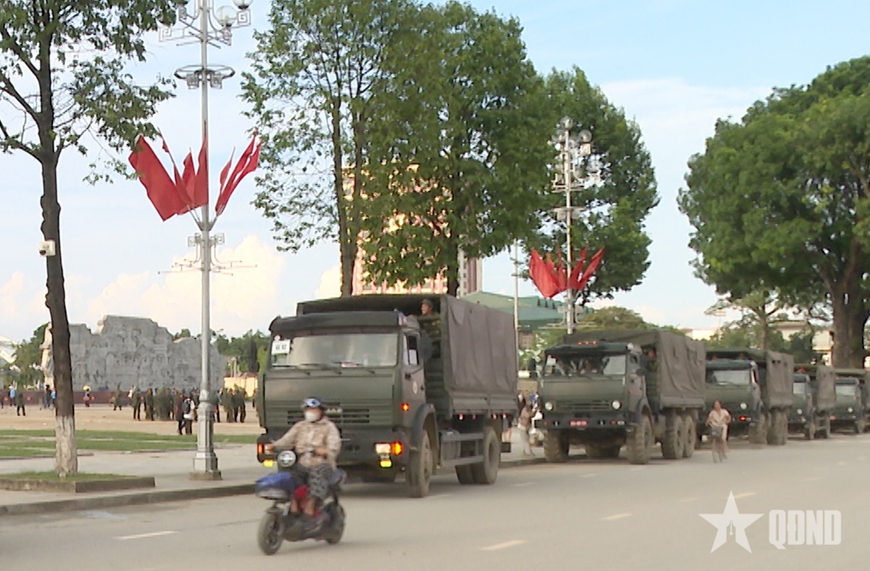 Đoàn xe chở bộ đội về đơn vị sau khi hoàn thành nhiệm vụ hỗ trợ khắc phục hậu quả hoàn lưu bão số 11 tại tỉnh Thái Nguyên. |