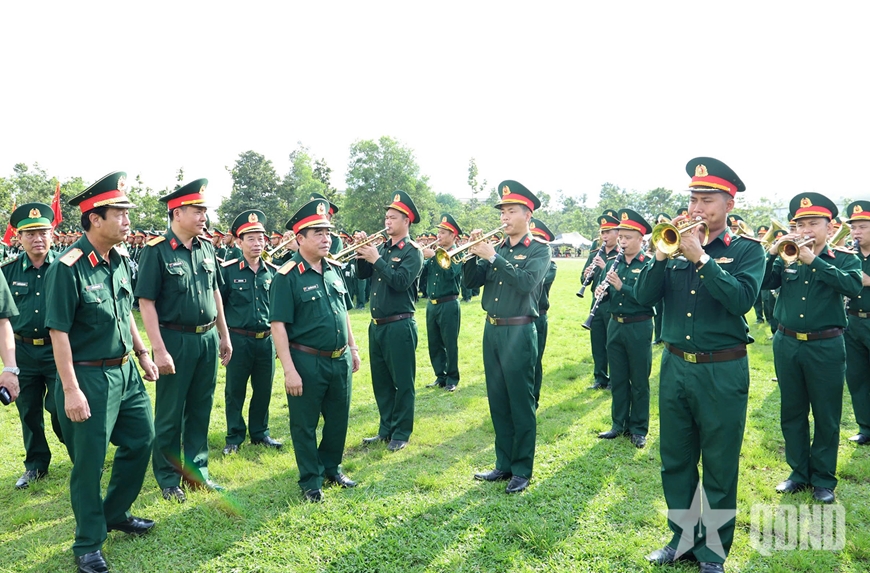 Thiếu tướng Nguyễn Bá Lực, Tư lệnh Quân đoàn 34 thăm hỏi, động viên lực lượng xếp hình nghệ thuật (Đoàn Nghi lễ Quân đội). |