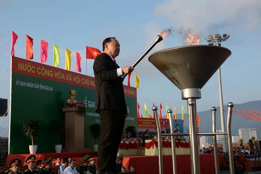 Đồng chí Thái Đại Ngọc, Ủy viên Trung ương Đảng, Bí thư Tỉnh ủy Gia Lai thắp lửa truyền thống tại Lễ giao nhận quân.