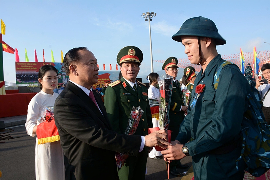 | Đồng chí Lê Hoài Trung, Ủy viên Bộ Chính trị, Bộ trưởng Bộ Ngoại giao tặng hoa chúc mừng thanh niên nhập ngũ. |