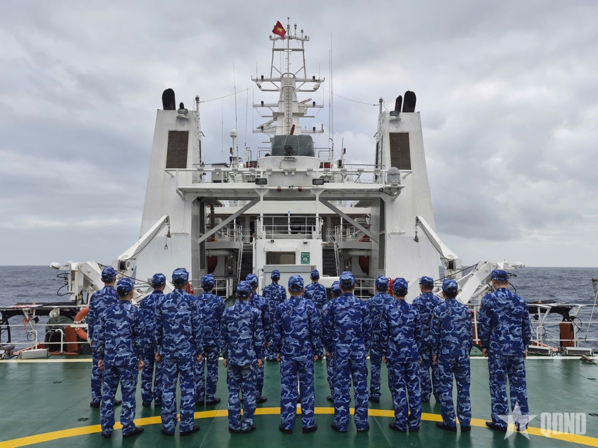 Khi những tia nắng đầu tiên của năm mới vừa rọi xuống mặt biển, toàn thể cán bộ, chiến sĩ chỉnh tề quân phục, đội ngũ ngay ngắn trên boong tàu lộng gió. Trước nền trời và sóng nước bao la, lá cờ đỏ sao vàng tung bay kiêu hãnh trên đỉnh cột. Khẩu lệnh “Chào cờ... Chào!” vang lên dứt khoát, đanh thép. Tất cả ánh mắt hướng về Quốc kỳ - biểu tượng thiêng liêng của Tổ quốc, của độc lập, chủ quyền và khát vọng hòa bình.