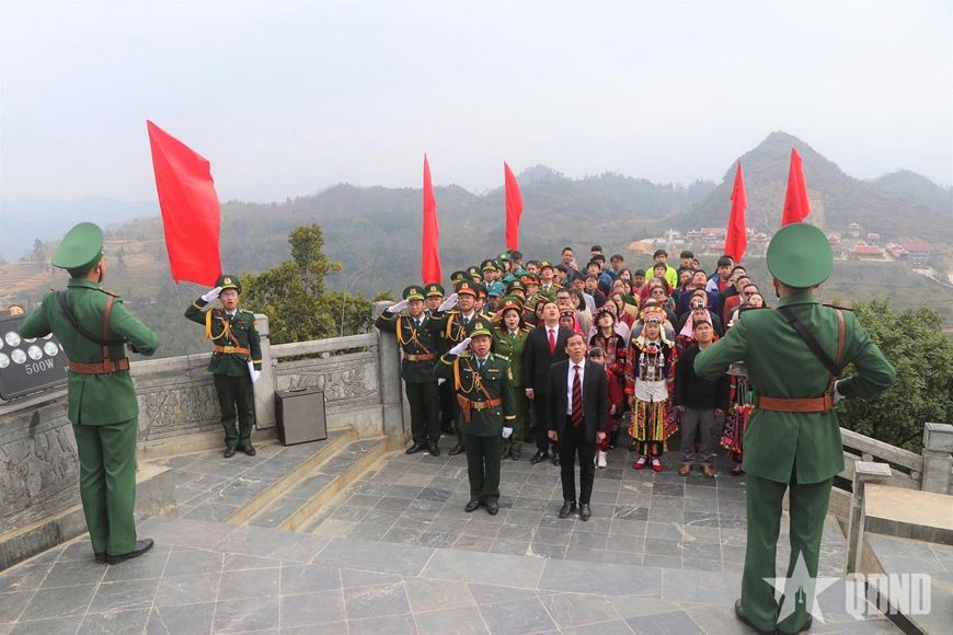 Các cán bộ, chiến sĩ Đồn Biên phòng Lũng Cú, Đảng bộ, chính quyền và nhân dân xã Lũng Cú chụp ảnh lưu niệm tại Cột cờ Quốc gia Lũng Cú.