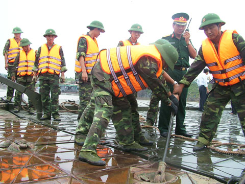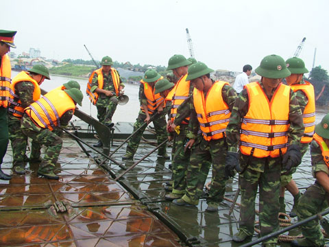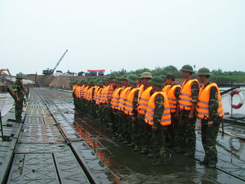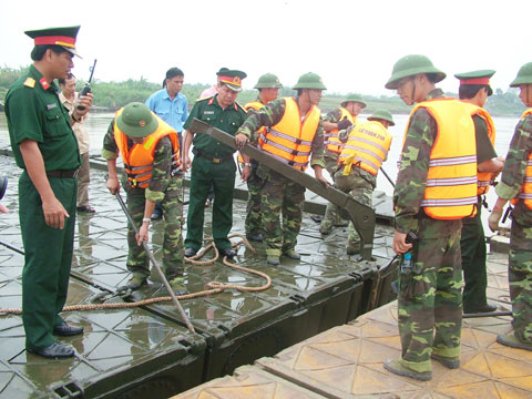 QĐND Online – Sáng 4-6, sau hai giờ làm việc nhanh chóng, khẩn trương, cán bộ, chiến sĩ Đoàn H49 đã kết nối thành công các đốt cầu, hoàn thành việc thông cầu kỹ thuật lắp cầu phao qua sông Đuống.
