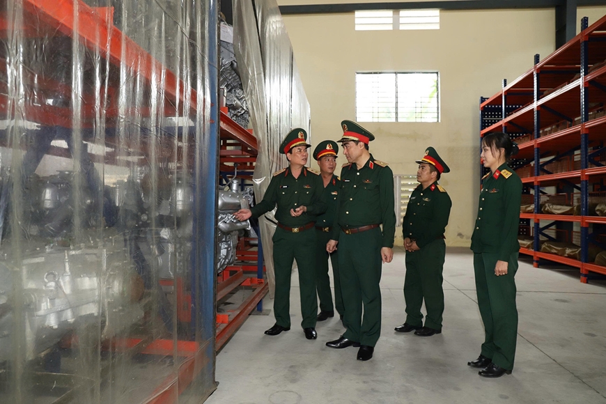 | Trung tướng Đỗ Văn Thiện kiểm tra công tác bảo quản, niêm cất vật tư kỹ thuật tại Nhà kho K5, Kho J258, Cục Xe máy - Vận tải. |