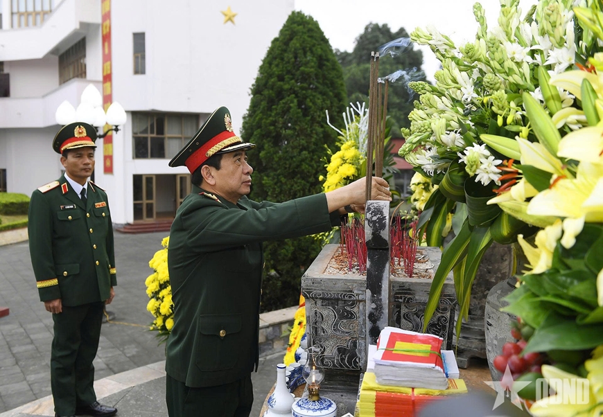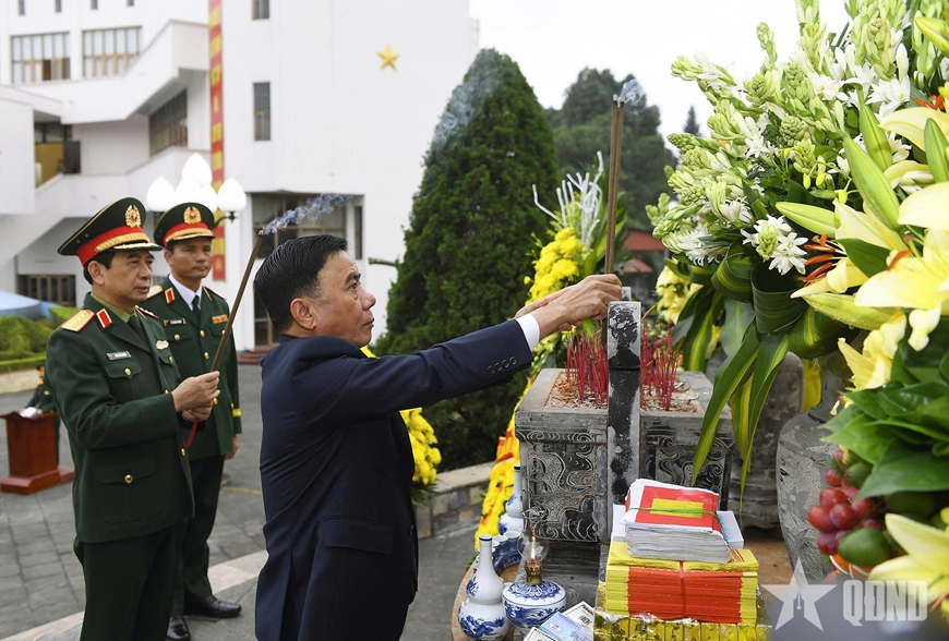 | Thường trực Ban Bí thư Trần Cẩm Tú và Đại tướng Phan Văn Giang dâng hoa, dâng hương tại Đài tưởng niệm các Anh hùng liệt sĩ Quân đoàn 12. |