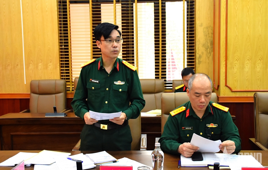 Đại biểu lãnh đạo Văn phòng Tổng cục Chính trị báo cáo tình hình, kết quả thực hiện công tác cải cách thủ tục hành chính trong Cơ quan Tổng cục Chính trị.