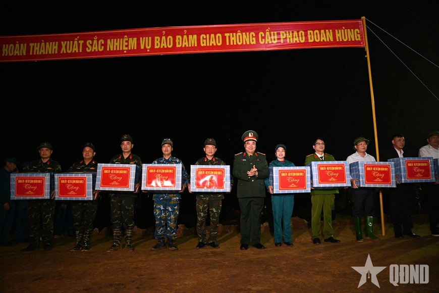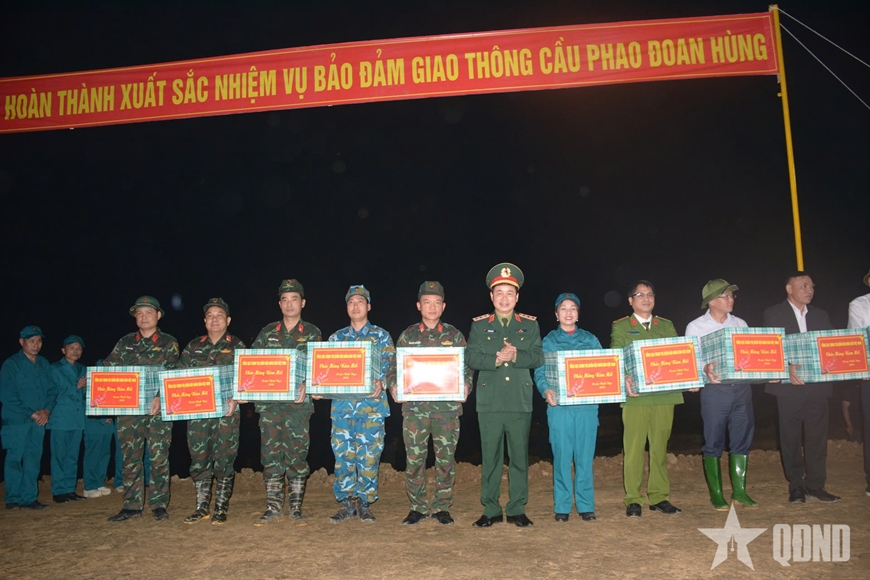 | Bộ tư lệnh Binh chủng Công binh tặng quà các lực lượng tham gia thi công cầu phao. |