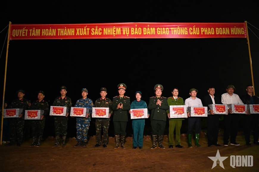 | Bộ tư lệnh Quân khu 2 tặng quà các lực lượng tham gia thi công cầu phao. |